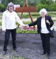 Tampó-Ababei József, csángó-magyar katolikus pap áldása, jobbról a Rákosmente Polgári Kör vezetője, a táblaállítás hivatalos kezdeményezője |