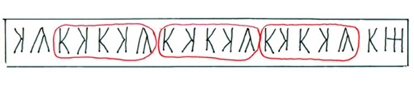 és egy jobbra néző Ö betű után háromszor ismétlődik a rovás G és az ezt követő